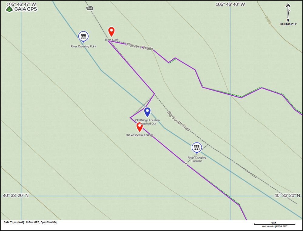 What: It was originally published on the Northern Colorado Trail Guides that there was a bridge to to cross the Cache la Poudre River. It turns out this bridge was washed out years ago and was never rebuilt. The river runs quite high throughout the season from seasonal runoff to the flow control from the Long Draw Reservoir. This poses a serious risk to backpackers hiking these routes. This is a major river ford and should not be underestimated.
